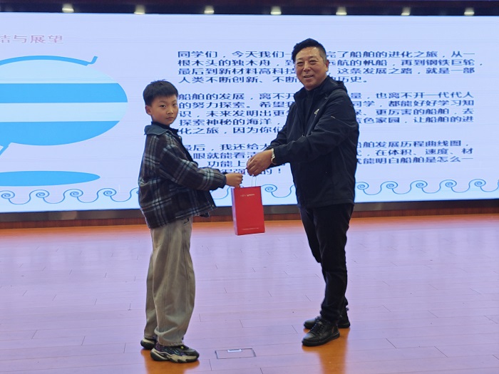 本次活动是湖滨实验小学推进“四精四有”科学教学实践的重要举措,旨在丰富学生科学素养,拓宽知识视野,引导孩子们从生活中发现科学、探索科学。活动现场,汤总结合自身从业经验,用通俗易懂的语言、生动鲜活的案例,向孩子们讲解船舶相关知识、海洋探索历程,将抽象的科学原理转化为可感知、可理解的内容,让孩子们直观感受海洋世界的神奇与魅力。